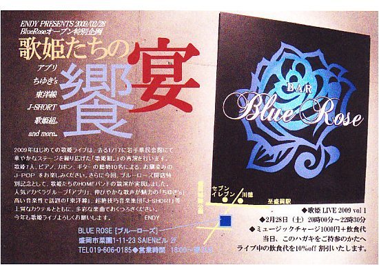 昨年、3月~にっか亭スピリッツで行われていた歌姫ライブは、1月にオープンしたBAR Blue Roseにて新しくスタートする事になりました。